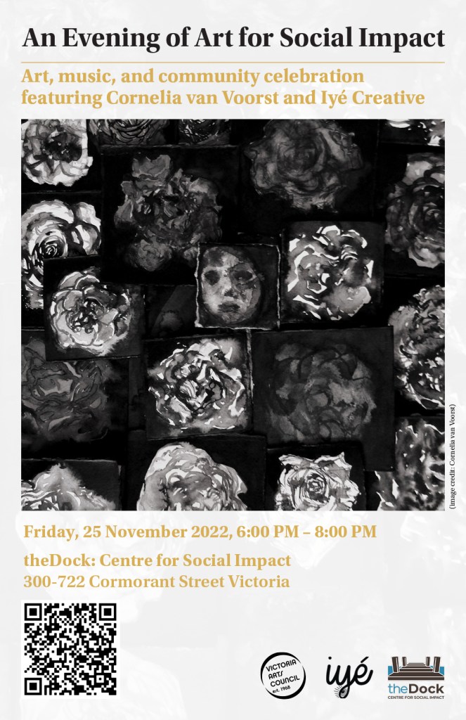 I have the privilege to be the current Artist in Residence at theDock, Centre for Social Impact from 28 October 2022 to January 23 2023. As well as having my work exhibited, I was able to talk about the themes and experiences that inform my work in an event that was also featured Iyé Creative – a food justice and grassroots collective. The exhibition, ‘Beloved Resistance’ is open for viewing from 9am to 430pm from Monday to Friday at 300-722 Cormorant Str, Victoria, BC Canada. With thanks to the Victoria Arts Council for this opportunity as part of their Satellite Gallery program.