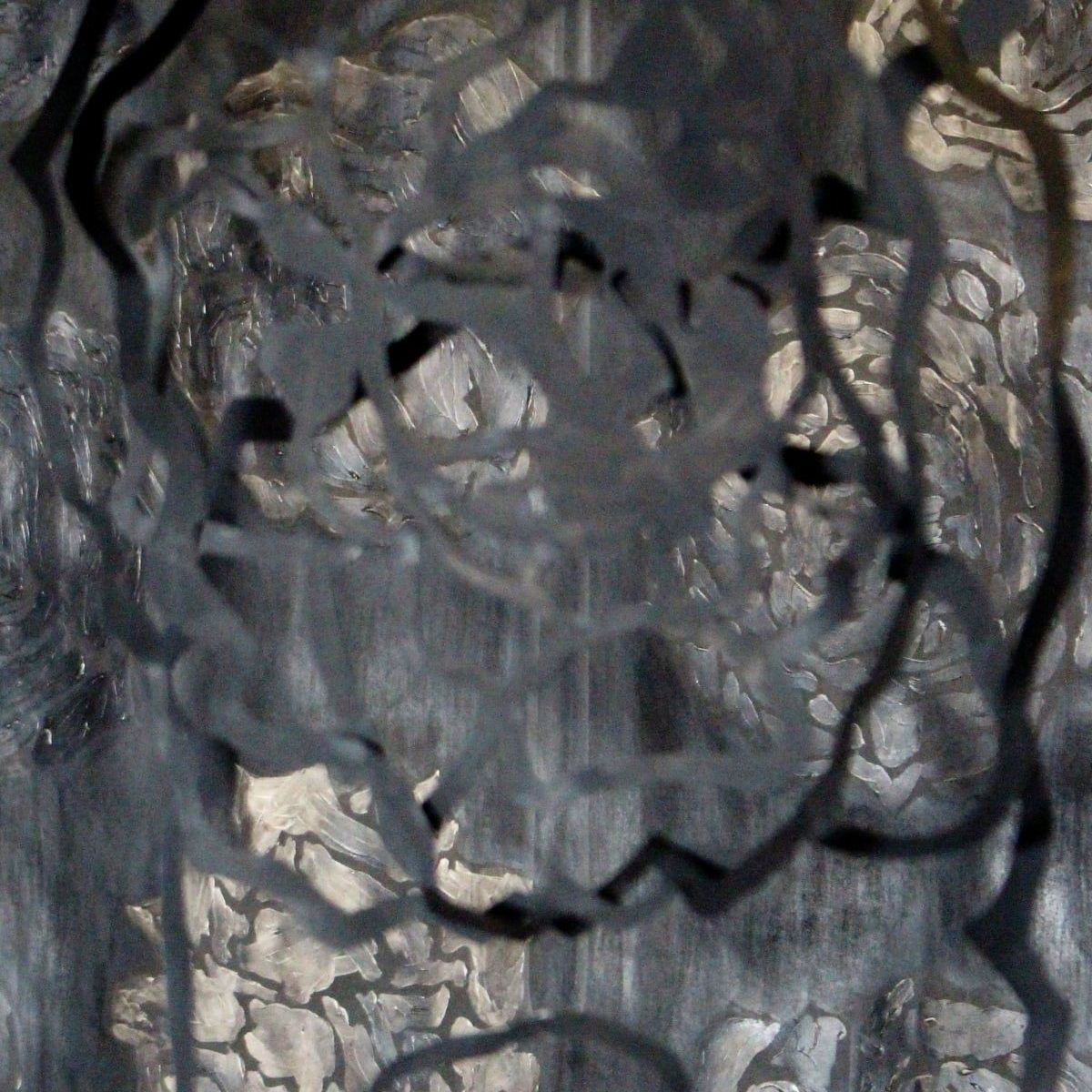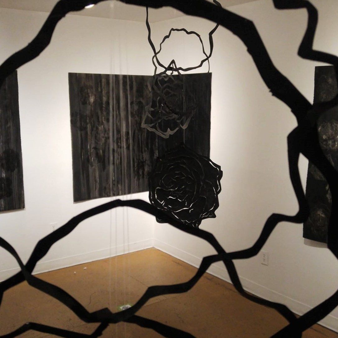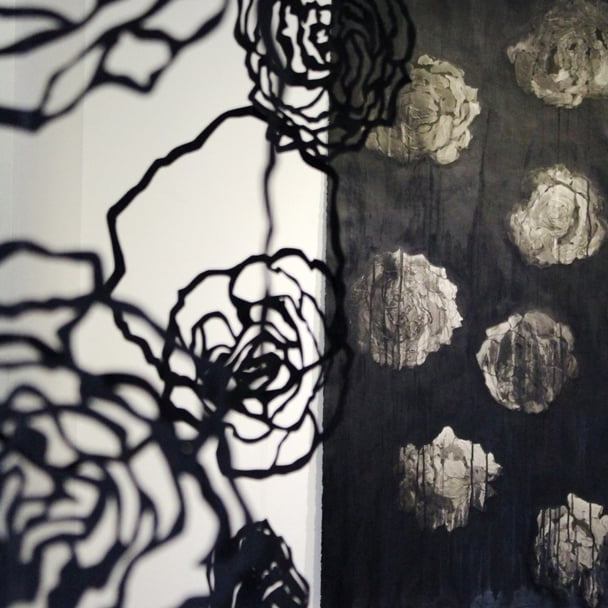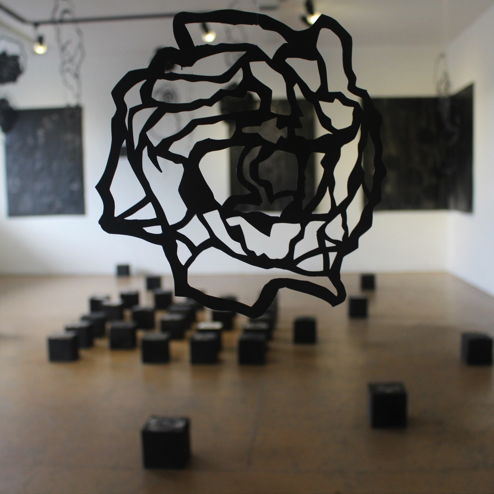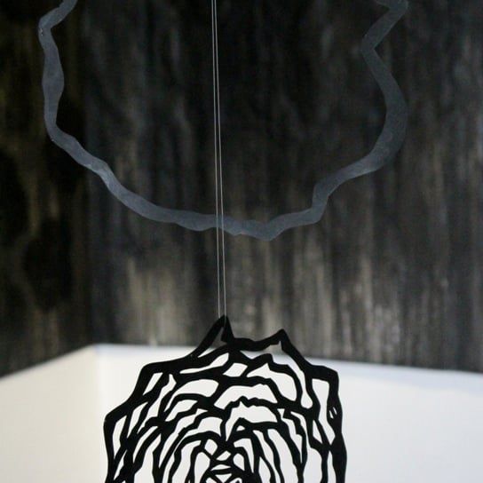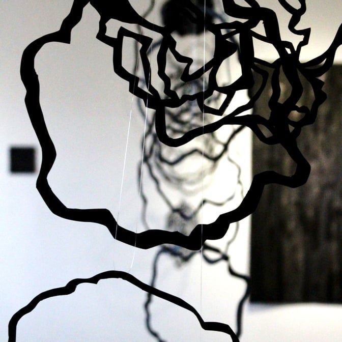 Do Not Call It Fixity investigates the variety of perspectives that are present within the ambiguity of lived experience. This installation demonstrates how past, present, light and shadow, known and unknown interweave. Depending on the position of the viewer, the single shape of a rose in relation to others becomes an abstract drawing, dark becomes pale, botanical becomes figurative. Limited interpretation is thwarted as the movement of the viewer, of air, light and the relationship with other elements of the exhibition provide both support and contrast to the mobile sculptures. These sculptures are hand cut from Stonehenge paper and hand painted with ink.