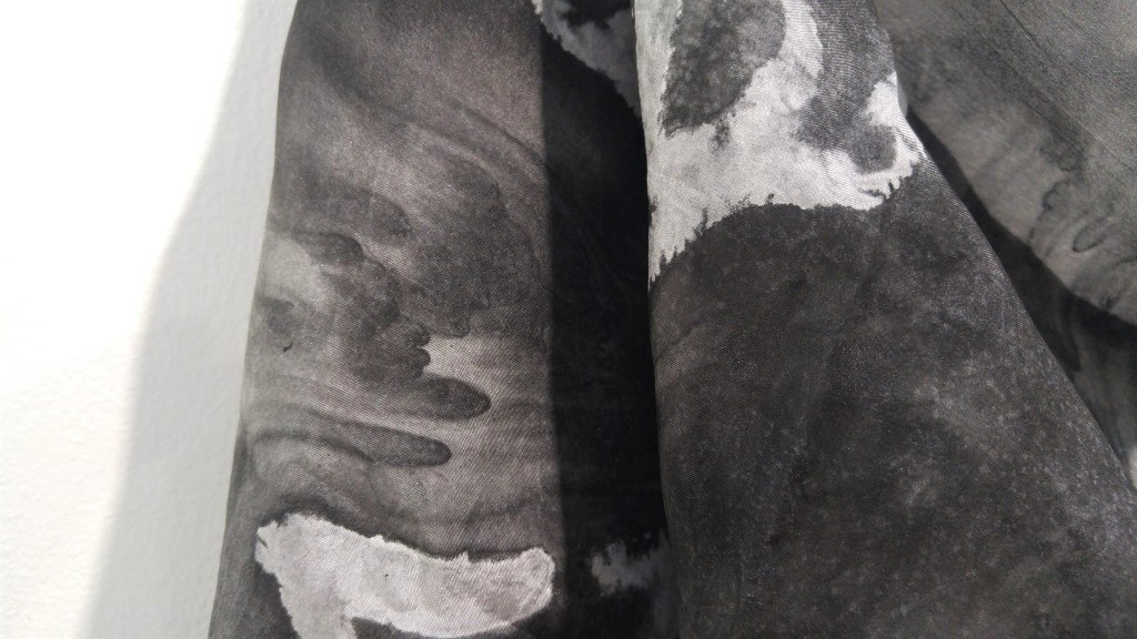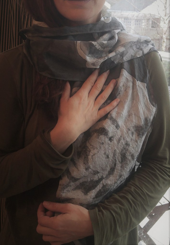 Silk holds its history, every squeeze and stress leaves its mark. There are techniques to remove the evidence of imperfection but I value the wrinkles that remain after the making process. These one-of-a-kind scarves are a reminder of how fragile we are, and how softness and sadness are signs of life being present no matter what. Wearing them helps us remember to attend to our hearts. The scarves wrap and protect our throats that may not have found the words to speak for our experience.