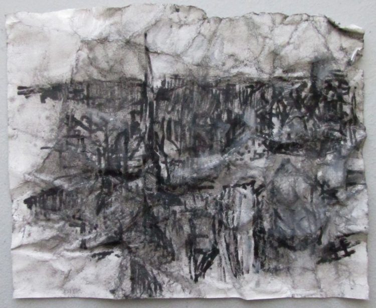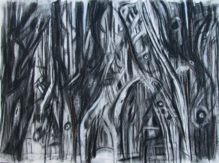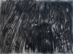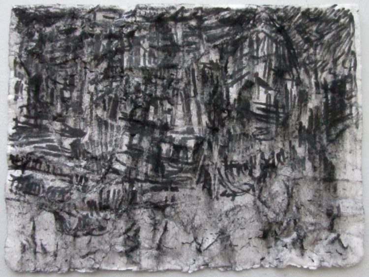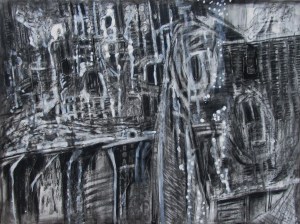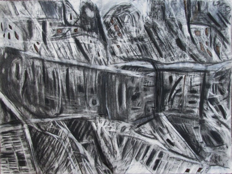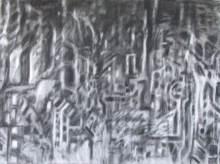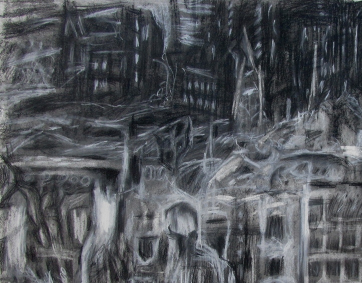 These abstracted drawings are based on segments of historical photos of bombed cities. The stripped bare structures mimic muscle and sinew, rib cage and spine; figures seem to be present among the ruins- yet this is not consciously sought after- the process of expressive drawing causes the the depiction of ruins to be subtly figurative. Buildings are inverted ghosts; empty form and material with their inhabitants and inner life gone, imitating the metaphor we have used over thousands of years for human death .