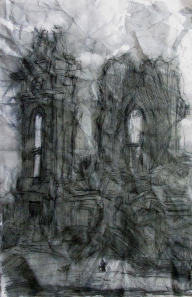 “what of our lady remains” 11″X7″, ink on crushed stonehenge