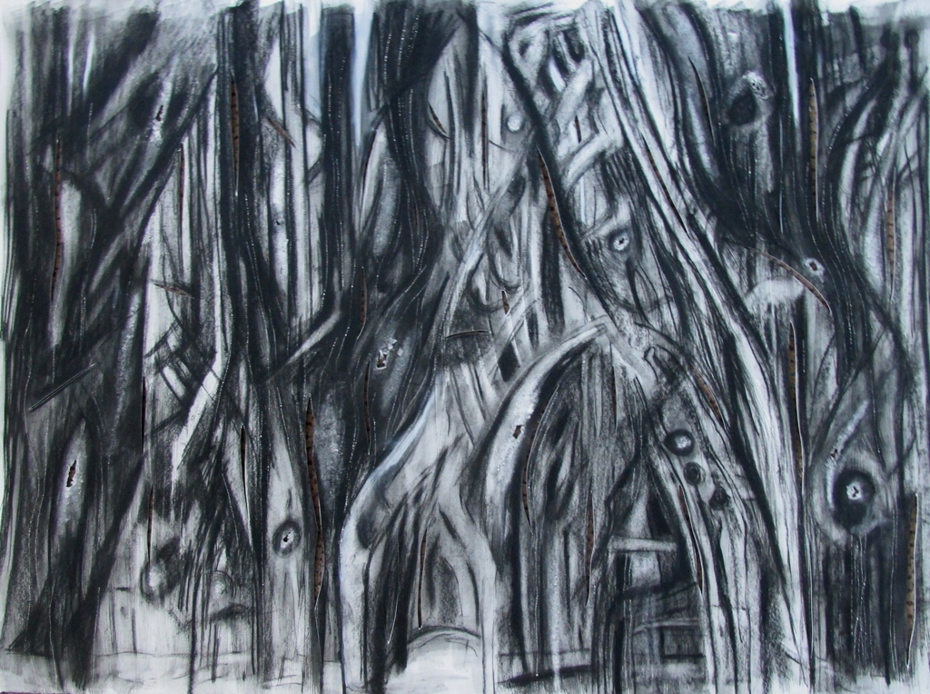 “past the dreadful” 22″x30″ charcoal, conte, eraser, on stonehenge.